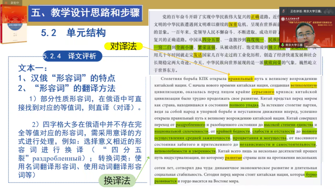 随后,南京大学汪磊老师以《高级汉俄翻译教程》第二单元“千磨万击还坚韧,任尔东西南北风” 为主题,从课程概要、教学目标、教学重点及难点、教学理念、教学方法、教学设计思路和步骤以及课程评价六个方面进行了教学展示。在第五部分教学设计思路和步骤中,汪磊老师以核心概念的知识背景及翻译方法讲解、关键语句课外延伸知识的导入方法及译文评析中汉俄对比的讲解方法等内容,为全国高校俄语教师奉献了精彩的授课展示。在交流环节,汪磊老师就参会者提出的该门课程如何与翻译课进行配合使用和课程体系设置问题为大家进行了解答。