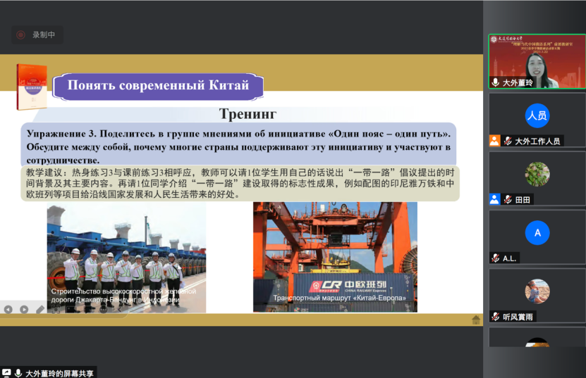 本期教研活动由《理解当代中国:俄语演讲教程》主编、北京外国语大学黄玫教授主持。黄玫教授简要介绍了演讲教材的编写团队和前期已经开展的相关培训和教学分享,此外,她还介绍到,2022年8月教材出版后,在外研社的指导和支持下,“理解当代中国”俄语系列教材的四册编写团队各自完成了本册教材的教师用书和教学课件PPT的制作,这些资源都已上传至外研社网站,各位老师可以下载参考使用。