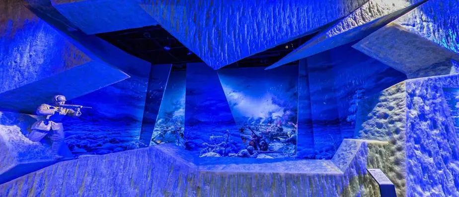在抗美援朝战争历程全景沙盘中,实景沙盘+LED光点演示全面展示抗美援朝战争进程,作战双方的进攻路线、战斗态势一目了然;在冰雪长津湖场景中,运用时空并序的方法设计背景油画和近景,以裂开的冰块为外形,通过声、光、电展示志愿军战士在冰雪中鏖战的悲壮场面;在家喻户晓的白虎团奇袭场景中,选取了幻影成像+LED的手段来展示两个不同的空间,在形式上令人耳目一新。