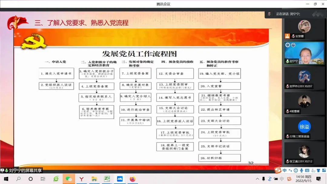 “心中有榜样,脚下有力量。”紧接着,刘宁宁老师带领同学们进一步熟悉入党的基本条件,从发展党员的工作流程到入党申请书的书写规范,解答同学们关于入党申请方面的疑问,鼓励同学们积极入党。会议末尾,刘宁宁老师带领同学们回顾习近平总书记对当代大学生的殷切寄语,并观看优秀党员模范相关影片。发挥榜样作用,确立了同学们“有信念,有梦想,有奋斗,有奉献的人生才是有意义的人生”的正确目标。
