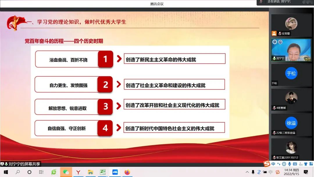 “以史为鉴,面向未来。”刘宁宁老师首先带领大家了解学习党的理论知识,了解中国共产党百年以来四个历史时期的奋斗历程。再现了中国共产党从救国、兴国,再到富国强国的波澜壮阔史诗。让同学们明晰了什么是中国共产党,党的指导思想,基本路线以及宗旨等问题,鼓励同学们争做新时代优秀大学生,为建设社会主义现代化强国的目标不懈奋斗。