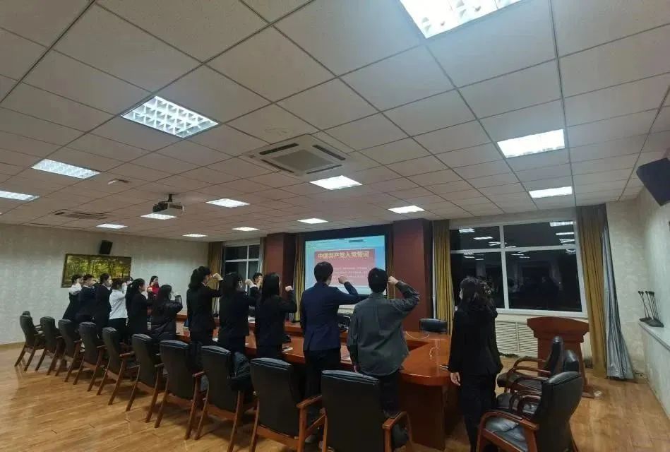 随后,大家面向鲜艳的党旗,庄严地宣誓,相信这神圣的一刻将永远铭记在他们的心中。会议最后,王健老师宣布支部决议并作总结。老师强调,应当把入党作为新的起点,充分发挥自身优势,在学习和生活中起到模范带头作用,不断发光发热。