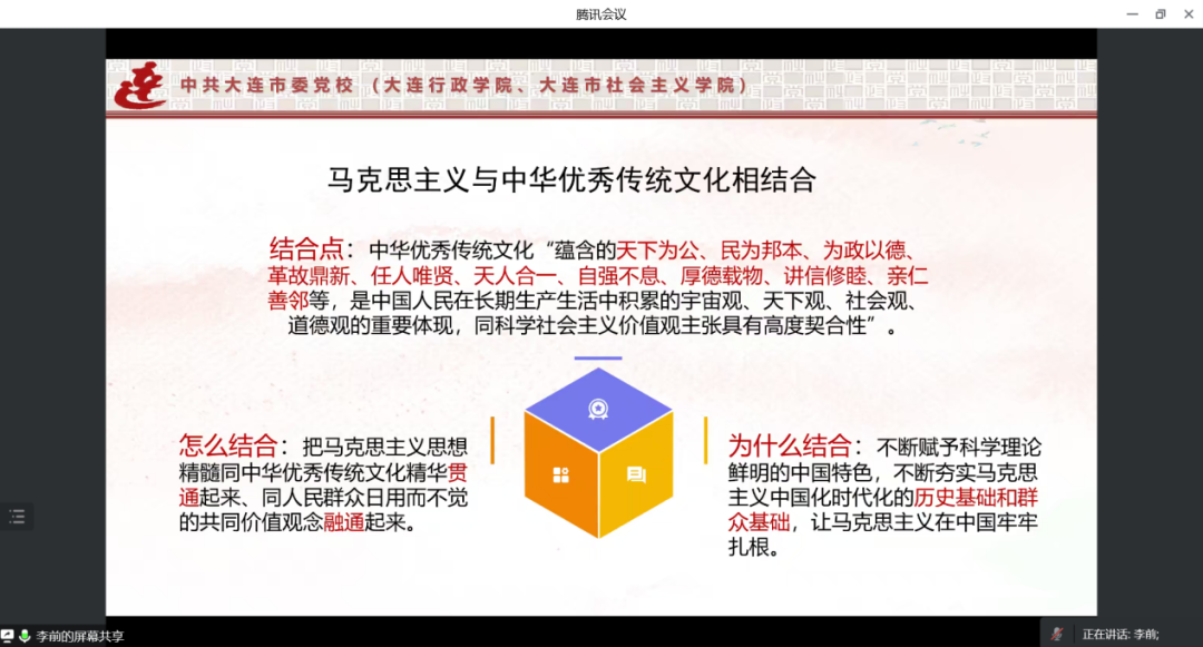 李前老师指出,党的二十大报告是擘画复兴新蓝图的马克思主义纲领性文献。中国共产党人深刻认识到,只有把马克思主义基本原理同中国具体实际相结合、同中华优秀传统文化相结合,坚持运用辩证唯物主义和历史唯物主义,才能正确回答时代和实践提出的重大问题,才能始终保持马克思主义的蓬勃生机和旺盛活力。