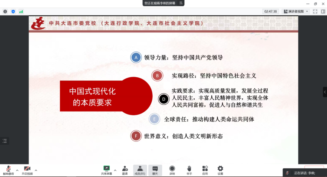 最后,李前老师强调中国式现代化的本质要求,要坚持把握五个规律性认识,要深刻领悟党的二十大的主题,坚定信心、同心同德、埋头苦干、奋勇前进,为全面建设社会主义现代化国家、全面推进中华民族伟大复兴而团结奋斗!
