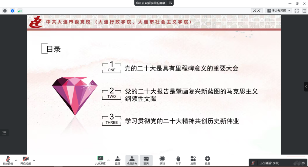 李前老师围绕“党的二十大是具有里程碑意义的重要大会”、“党的二十大报告是擘画复兴新蓝图的马克思主义纲领性文献”、“学习贯彻党的二十大精神共创历史新伟业”这三个方面展开讲授。从中华民族发展史的角度为大家梳理了历届全国人民代表大会内容,结合具体事例,使大家深入学习贯彻党的二十大精神,准确领会把握党的二十大报告的重要意义。