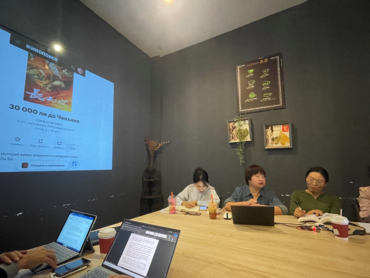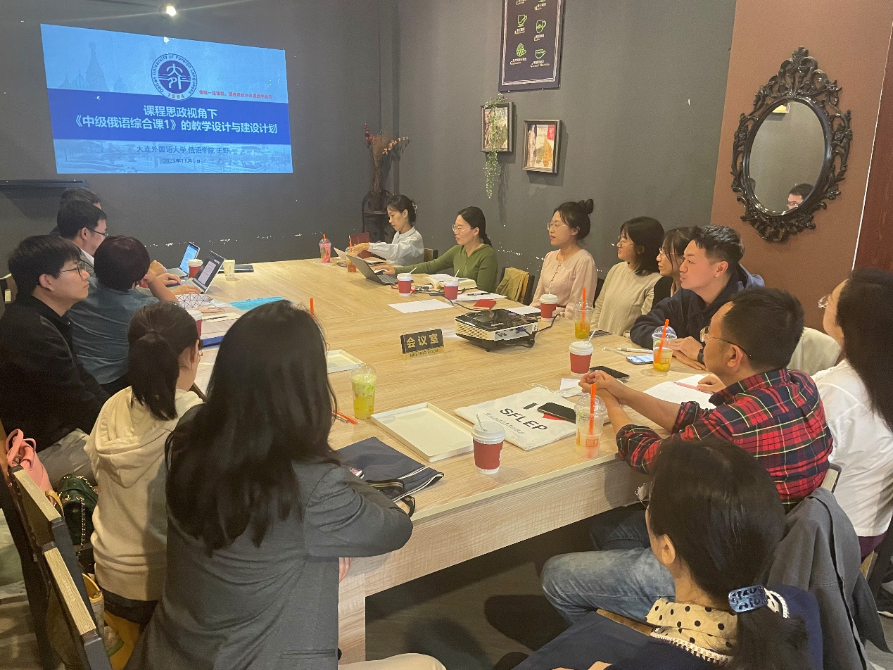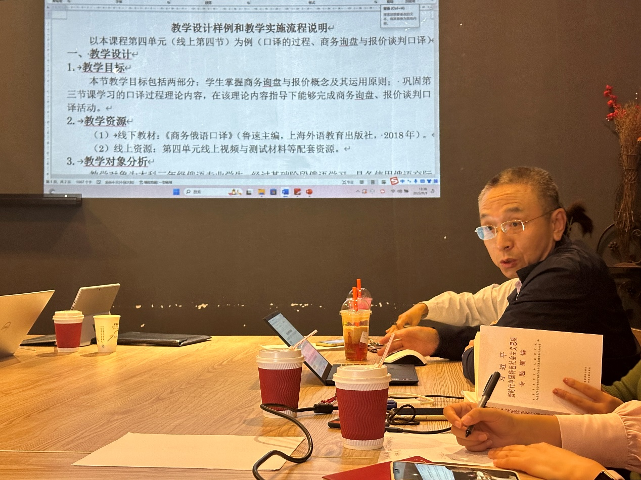 随后,四位省级一流课程教师代表进行了示范课展示。鲁速老师以《国际商务俄语口译》课程为例,重点示范商务询盘与报价谈判的口译过程教学。刘铁妹老师以《中国文化(俄语)》课程为示范,从中俄文化对比的角度讲述了影片《长安三万里》、诗歌《静夜思》中的文化精神。王野老师重点示范《中级俄语综合课2》的教学设计和建设计划,提出理解外语课程思政的教育政策、课程理论和课程特点三个维度。王楠楠老师以《初级俄语综合课》的“双向语言文化交流+数字人文融合”教学创新为重点,从课程概况、学情分析、教学目标、教学理念等方面进行了深度讲解。