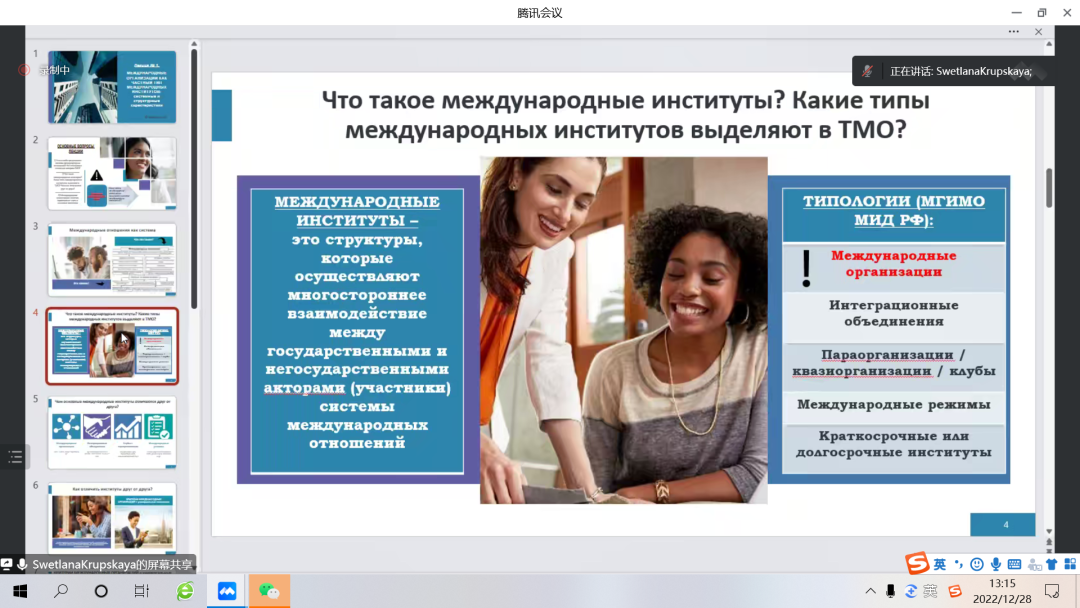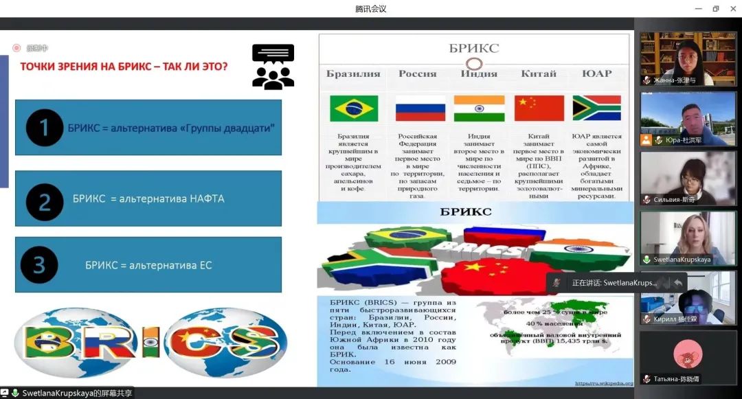 部分高年级学生和研究生参加《国际组织概况》专题国际化课程,主讲人为别尔哥罗德国立大学的Светлана Юрьевна教授。课程内容包括国际组织的类型、发展阶段和经典案例讲解等,通过对具体国际组织性质、任务和发展历程等方面的分析,使学生深入了解国际组织架构和国际关系问题。课程由中外老师共同组织授课,过程中学生和老师积极互动,通过答疑、讨论和课堂展示等环节巩固加深对所学知识的理解。
