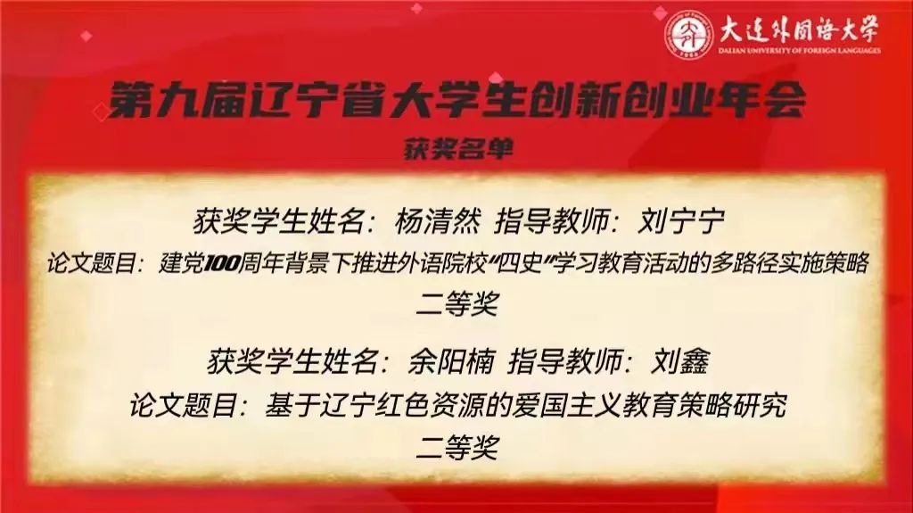 2021年大学生创新创业训练计划优秀项目成果的评选工作于4月开始推进,经项目团队申报和学校“大创”专家组评审后选定的优秀项目获推至年会。其中,俄院学子负责的2个项目立意新颖,均斩获二等奖优异成绩,它们分别是由余阳楠负责的“基于辽宁红色资源的爱国主义教育策略研究”和由杨清然负责的“建党100周年背景下推进外语院校‘四史’学习教育活动的多路径实施策略”。两位同学作为皇冠信誉网