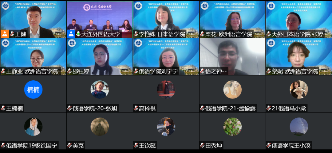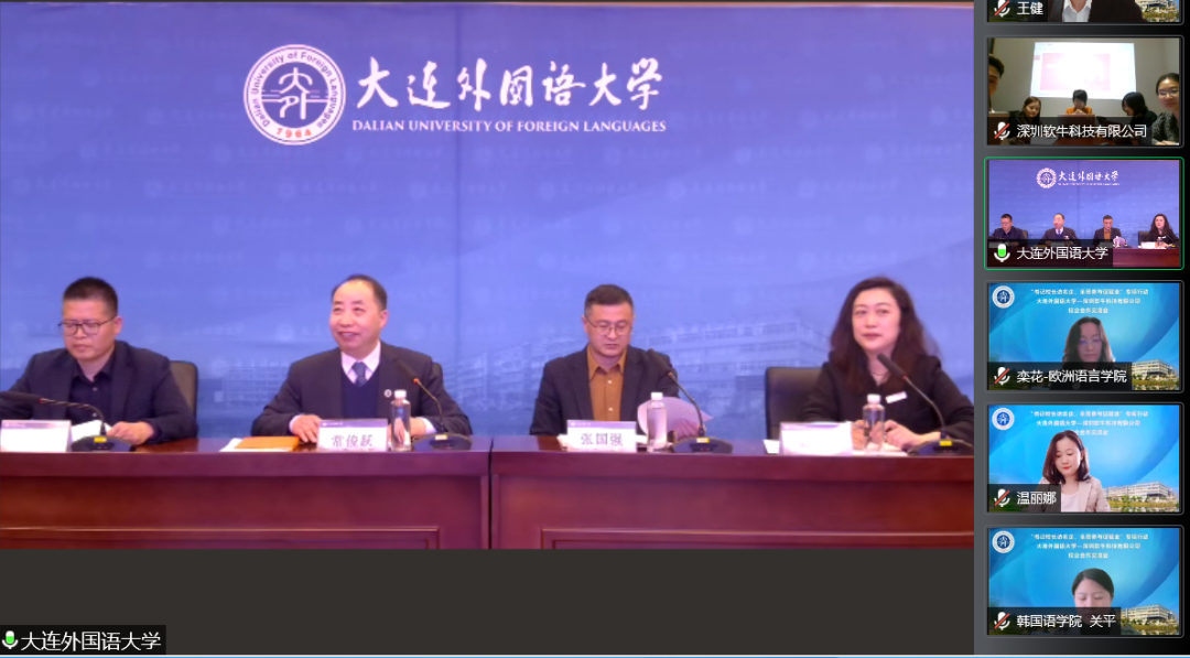 负责承办。大连外国语大学副校长常俊跃带队分别与江苏玺礼教育咨询有限公司、深圳软牛科技有限公司开展校企合作线上交流会。校企双方就毕业生就业情况、企业需求、人才培养、校企合作模式等问题进行了深入交流。