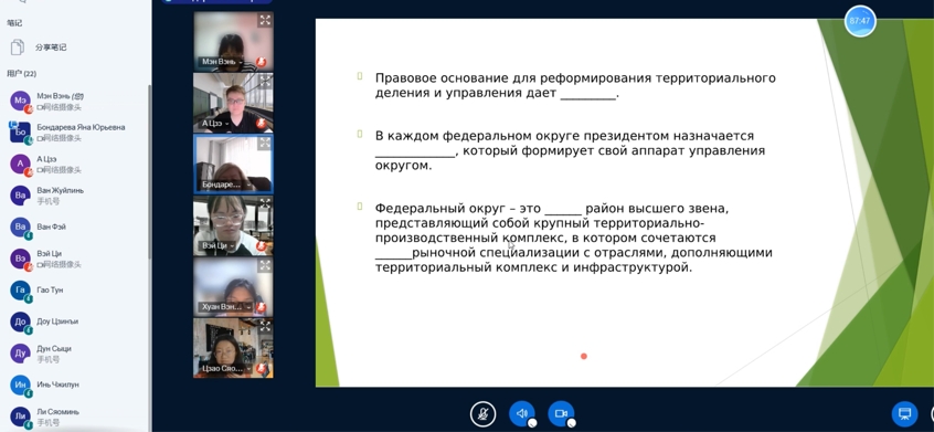 部分本科生和研究生参加《俄罗斯经济》专题国际化课程,主讲人为别尔哥罗德国立大学的Яна Юрьевна教授。本次《俄罗斯经济》国际化课程主要分为八个章节授课,Яна Юрьевна教授从俄罗斯经济研究对象与研究方法、俄罗斯区域经济体系、俄罗斯经济发展战略、国家经济调控、俄罗斯经济区划等方面详细讲授了俄罗斯经济的相关知识。
