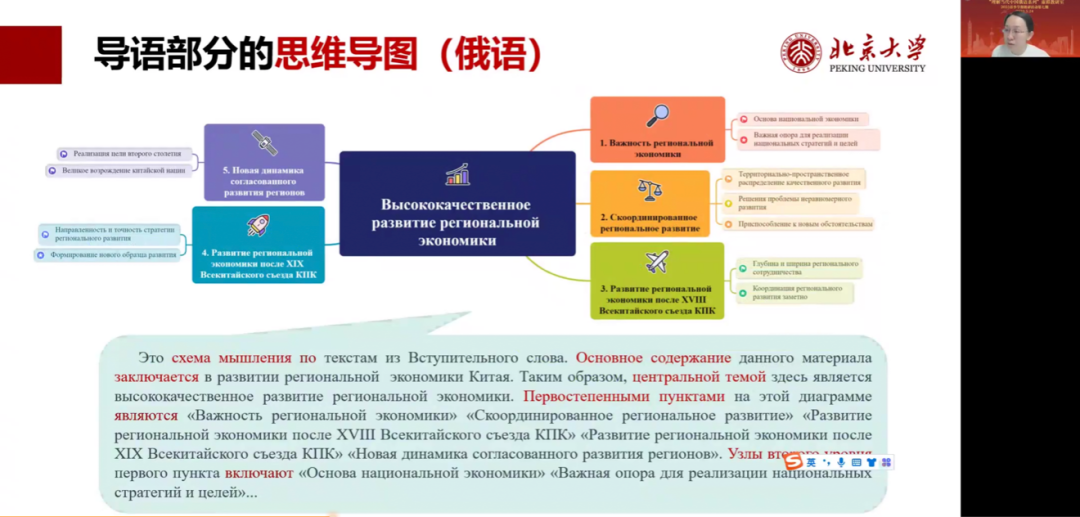 随后,北京大学刘淼老师进行教学示范分享,分享内容是《理解当代中国:俄语读写教程》第三单元《高质量发展》。刘淼老师首先将本课程在北京大学的课程设置、授课学时及教材应用等情况进行了介绍。