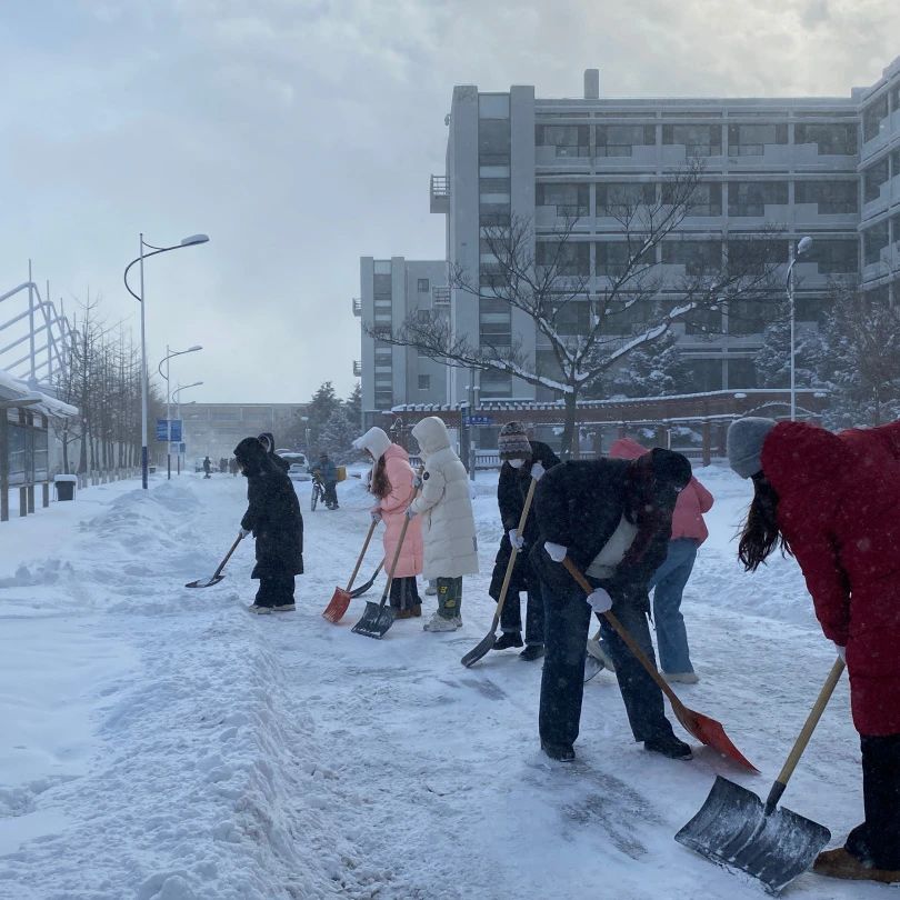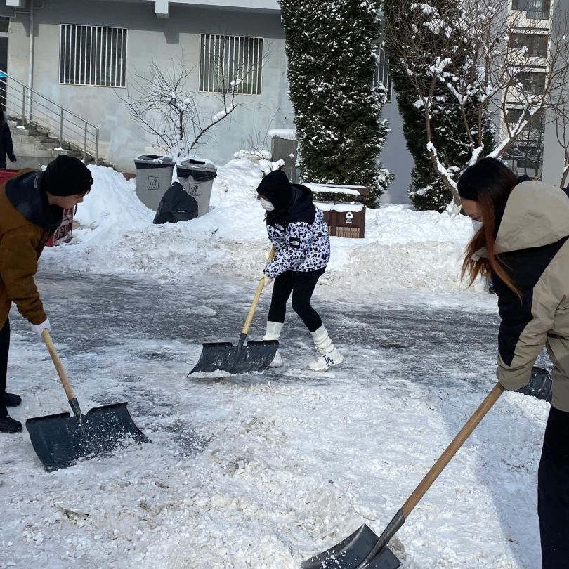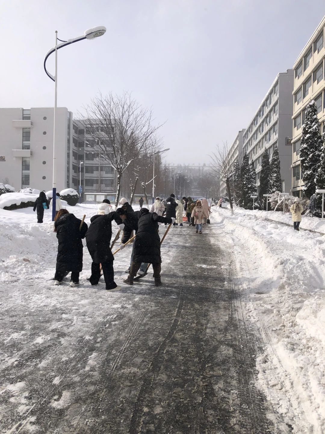 同学们冒着寒风,拿起除雪工具,积极踊跃的加入除雪队伍中。雪厚冰坚,同学们齐心协力的在雪中奋战,路上的积雪与薄冰渐渐被打扫干净,“安全通道”被清理出来,保障了师生的出行安全。
