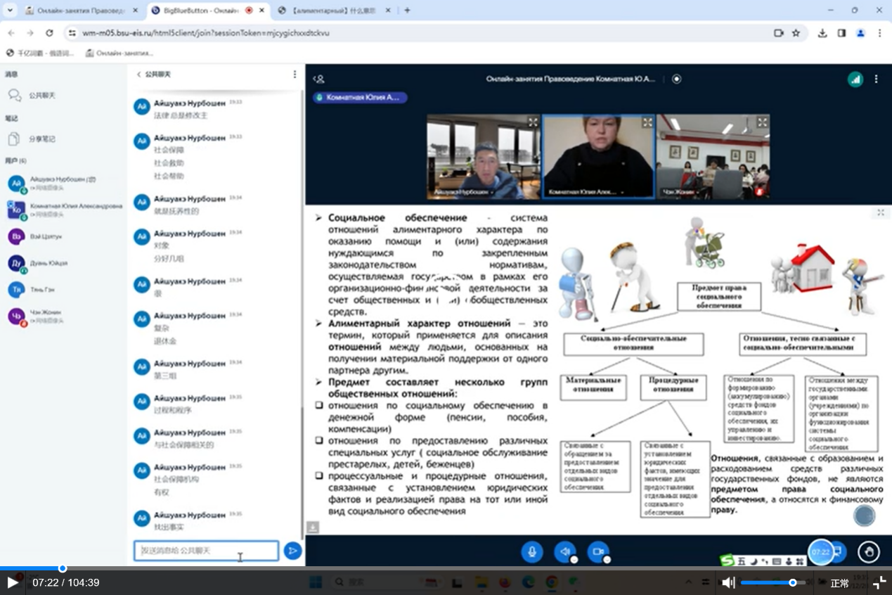 联合俄罗斯交流院校首次开设俄语授课的法律专业课程,无论从语言方面还是课程内容方面,对俄语专业的学生和老师都是巨大的压力和挑战。为了保证授课和学习效果,杜洪军老师借鉴了“国际组织概况”的教学模式:首先,要求同学们提前做好预习,熟悉授课内容;其次,要求俄方老师用案例教学法为学生构建理论基础;第三,采用互动式教学法,多提问、多讨论、多对比;第四,带班老师在平台聊天区用汉语归纳梳理课程讲解要点,帮助同学加深对内容的理解。