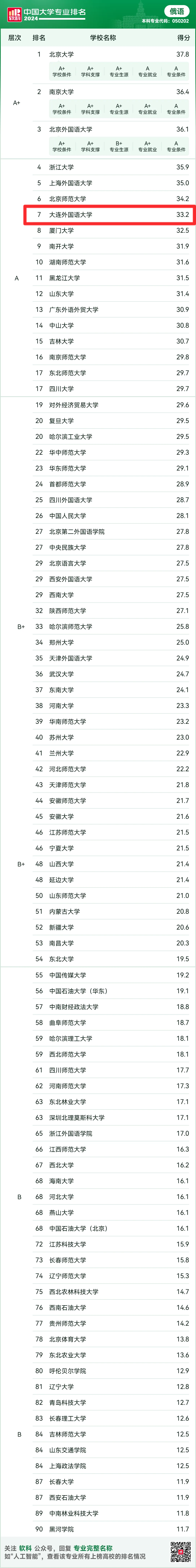 俄语专业获评“A”级专业,在参与评选的90所院校中,排名第7,得分33.2。