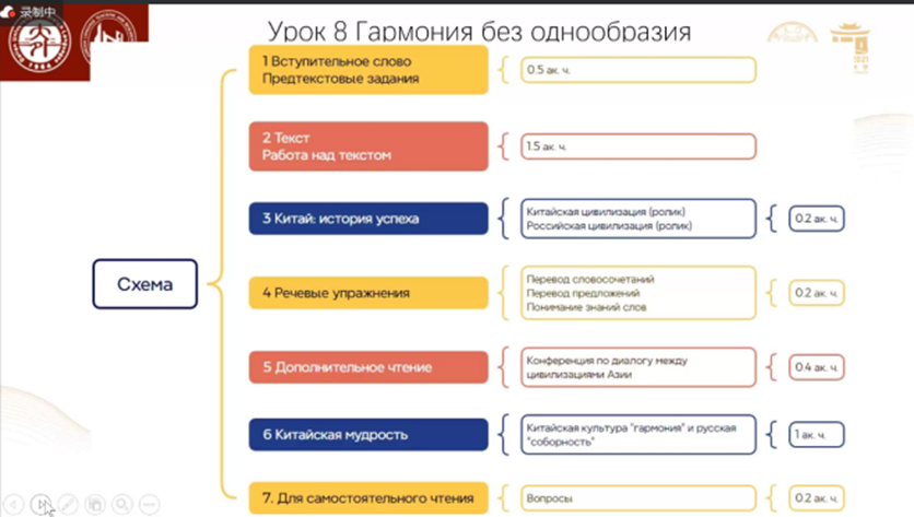 随后,于丹红副教授进行了《俄语读写教程》第八单元“和而不同”的课堂示范分享。她详细介绍了该课程在厦门大学的实施情况,并对第八单元的内容进行了深入讲解。课堂内容分为导入、文本学习、中俄文明对比、语句练习、课外阅读、中国智慧探讨以及相关问题探讨等多个环节。于丹红副教授重点介绍了本课的重点词语和语句,并对重点段落进行翻译、分析以及翻译技巧分享。在第六部分,于老师详细讲述了“和谐”“和而不同”等概念在中国文化中的意义以及俄语文化中的“聚和性”概念,并将中国的“和”文化与俄罗斯的“聚和性”文化进行了比较。