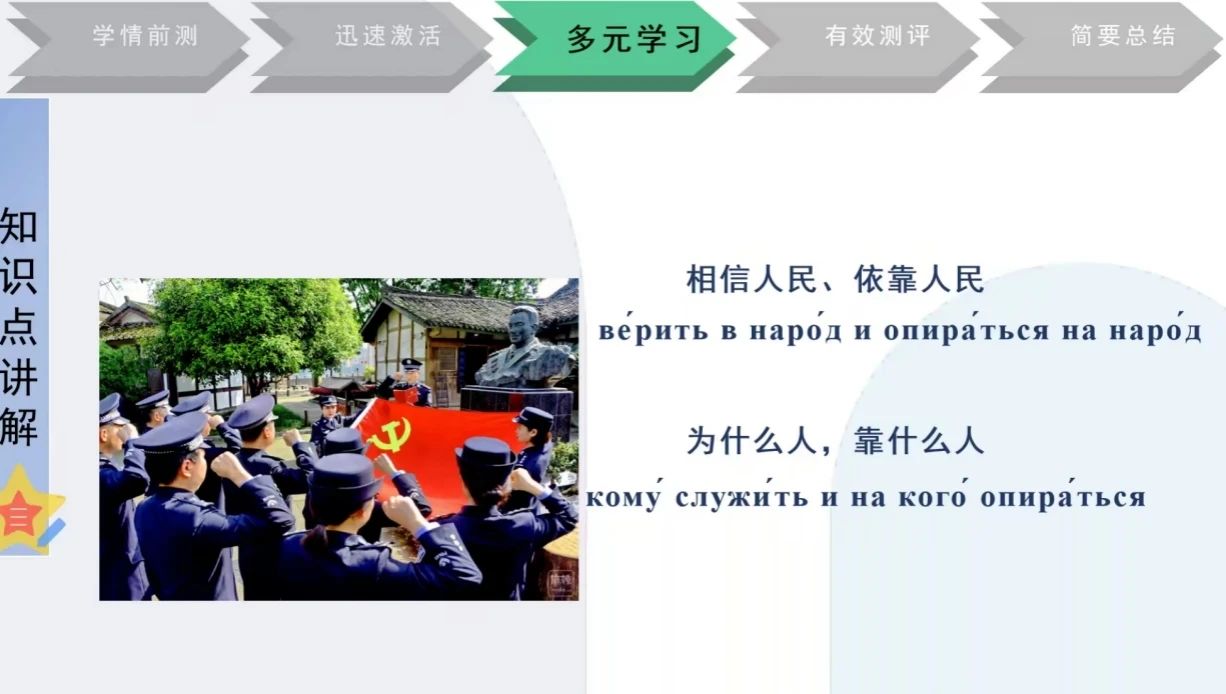 在教学示范环节,徐佩教授对《高级汉俄翻译教程》第三单元“江山就是人民,人民就是江山”进行课堂示范。徐佩老师首先向学生介绍课程的思政目标、知识目标和能力目标。为实现这些目标,徐佩老师精心设计了多个教学环节。在学习前测环节,教师通过问卷调查了解学生对所学内容的已知点、未知点和兴趣点,从而调整课堂讲授的重点和时间安排。在迅速激活环节,教师采用快速应答和多项选择翻译方法的方式,对核心概念进行复习和巩固,为学生后续的学习打下坚实基础。进入多元学习环节后,教师通过播放视频、小组讨论、示意总结等多种方式,激发学生的学习兴趣和主动性。在翻译实践环节,教师引导学生提炼出对偶修辞格的翻译方法,并通过判断对错、拼句练习等方式,加深学生对翻译技巧的理解和掌握。同时,教师还设计了“翻译回旋标”的教学活动,让学生们分组进行中文原文的翻译和译文还原,有效提升学生的跨文化交际能力和国际传播能力。最后,教师带领学生们进行知识和思政总结,并通过布置家庭作业,巩固和拓展学生的学习成果。通过一系列展示,徐佩老师生动、完整地还原了整个教学过程。