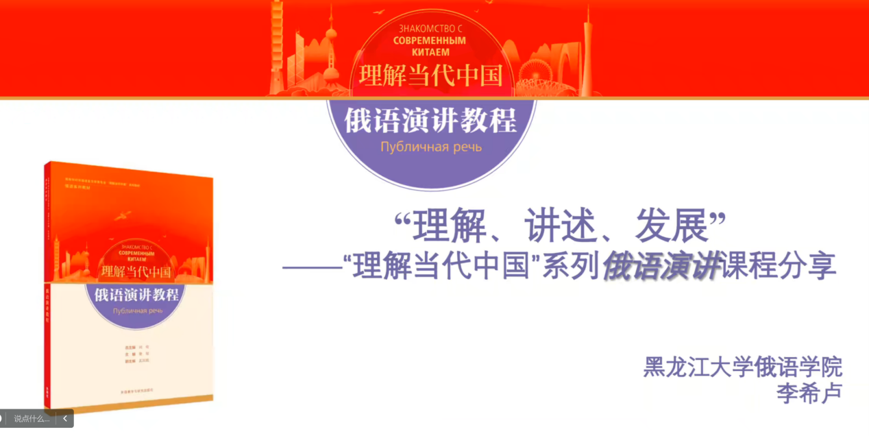 随后,李希卢老师以《理解、讲述、发展——“理解当代中国”系列俄语演讲课程分享》为主题进行分享,本次分享的内容是《理解当代中国:俄语演讲教程》第一单元“中国特色社会主义”的课程设计与教学展示。李老师就《理解当代中国:俄语演讲教程》在黑龙江大学的使用情况进行了介绍,并从课程与教材、教学与反馈、创新与反思三个方面对该课程进行了详细解读和教学展示。
