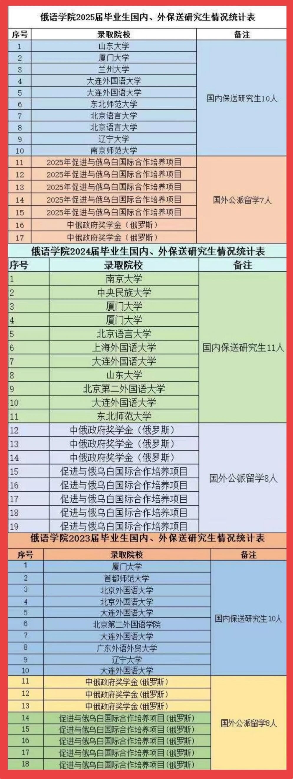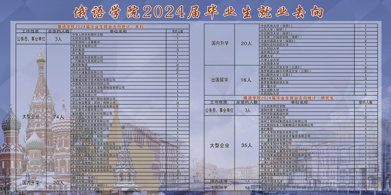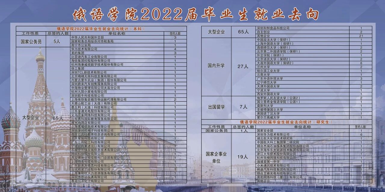 2023届俄语专业毕业生127人,其中国内保研10人,国外公派读研8人,保研及公派留学比例14%。