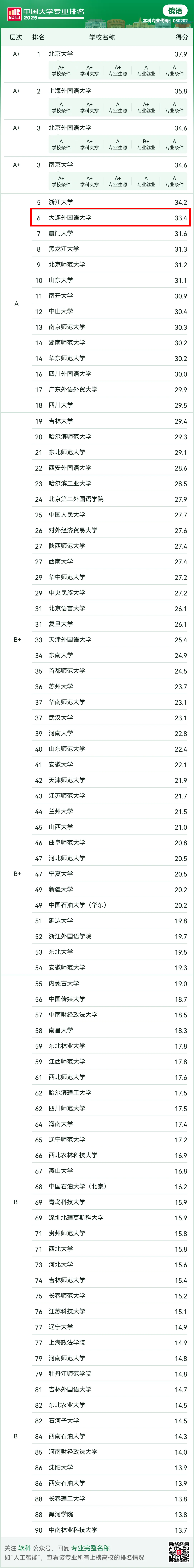 俄语专业排名较2024年上升了一位,位列第6名,得分为33.4。