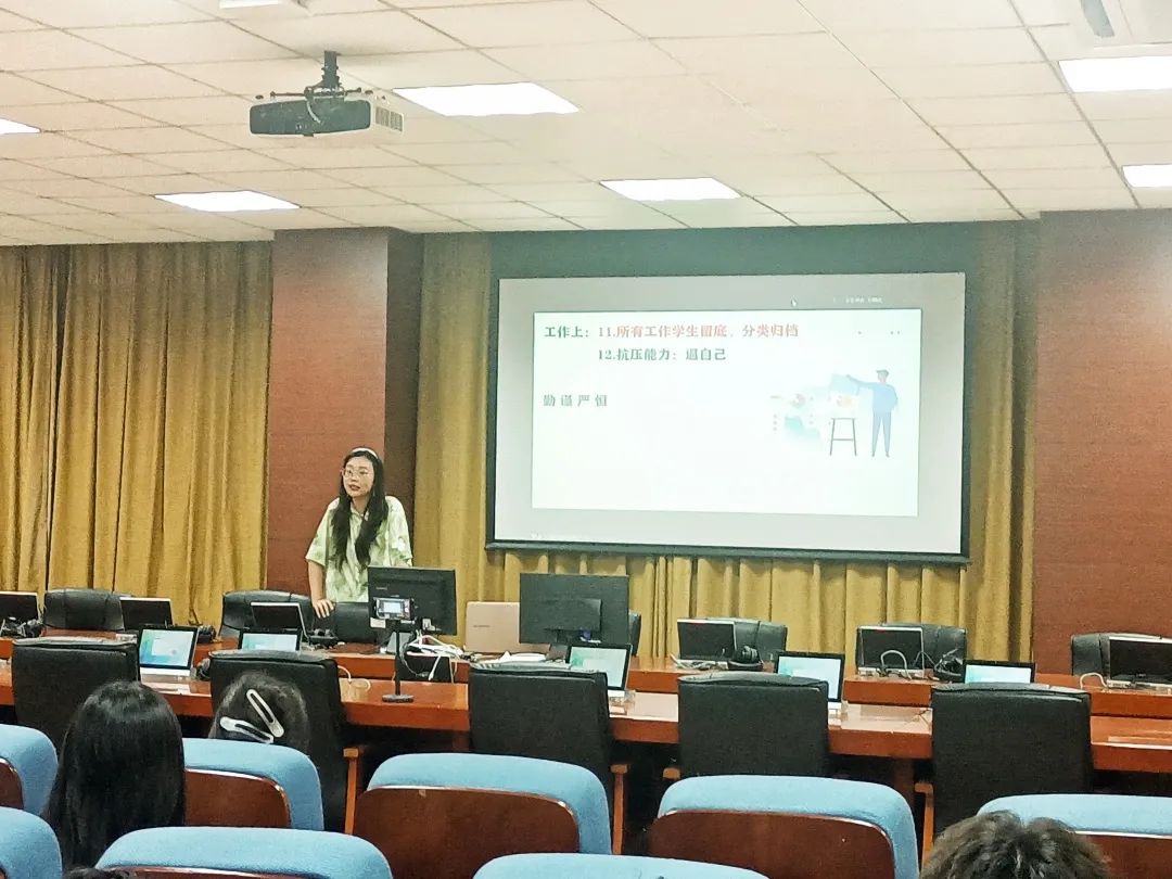 首先,陈芳博同学对学生干部们进行了全媒体技术的相关培训,内容涵盖素材处理、视频剪辑和推送制作等多个方面,正契合当下的自媒体热潮,实用性极强。随后,王德兴同学强调了学生干部们应具备的素质与技能,如策划能力、办公软件使用与时间管理意识等等,这些品质不仅能帮助学生干部们高效优质地完成工作,对今后的职场生活也大有裨益。最后,王婉欣同学对学生干部们提出了坚定理想信念的要求,作为老师与同学间沟通的桥梁、学生活动的组织者、学生工作的承担者,学生干部们应以自信、自谦、自省为目标严格要求自己,做到“勤谨严恒”,在更好地服务集体的同时,也不忘个人思想的提升。