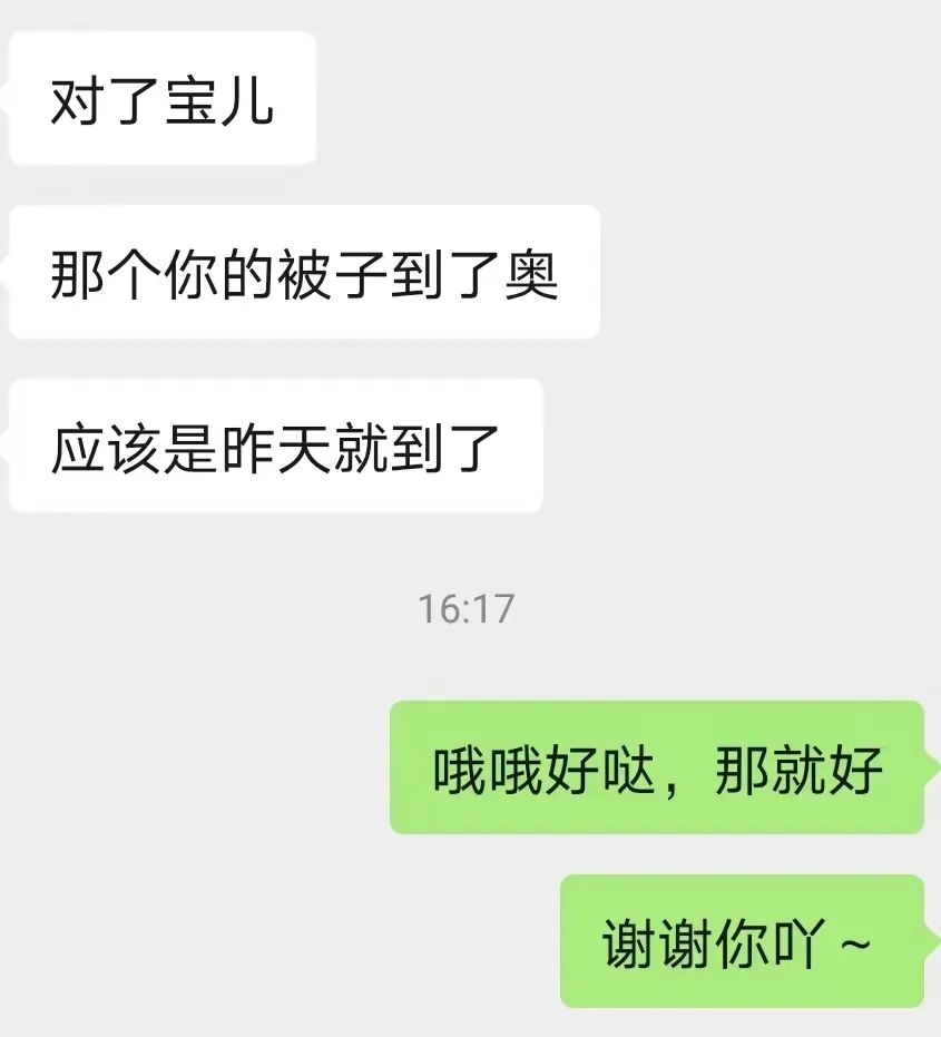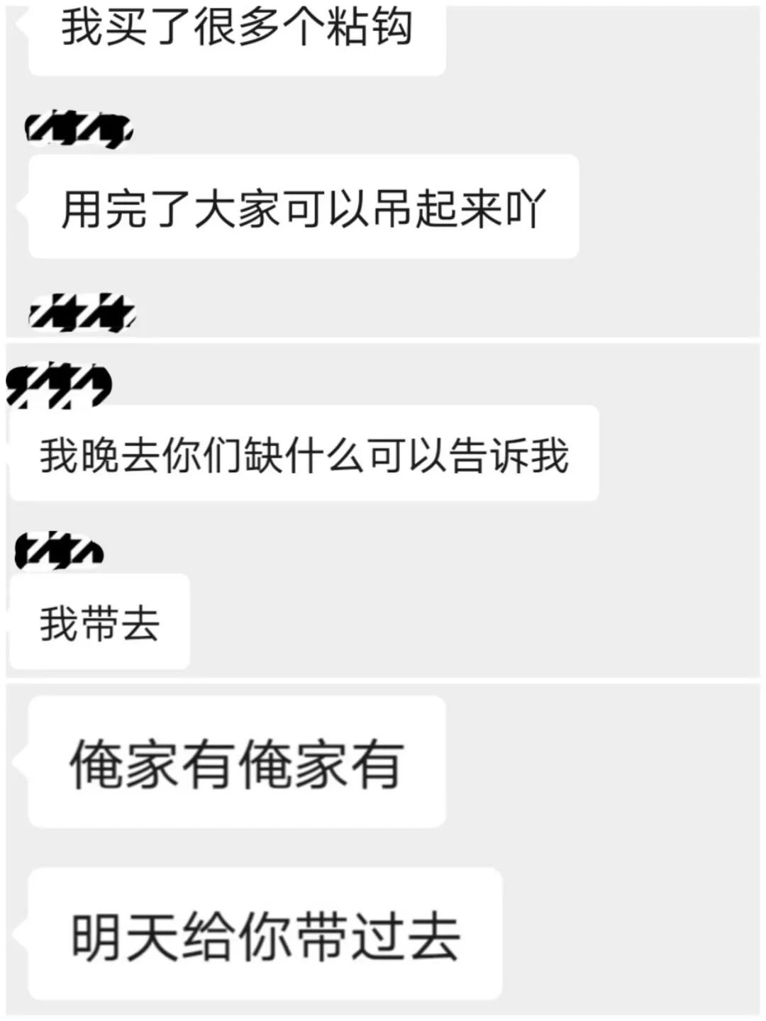 我:“希望遇到的室友都是好人。”没想到不仅愿望成真,而且室友们都很暖心。有贴补物资的热情,有为我查收被褥的及时,有询问我是否抵达酒店的关切,还有在群里的随时联系……