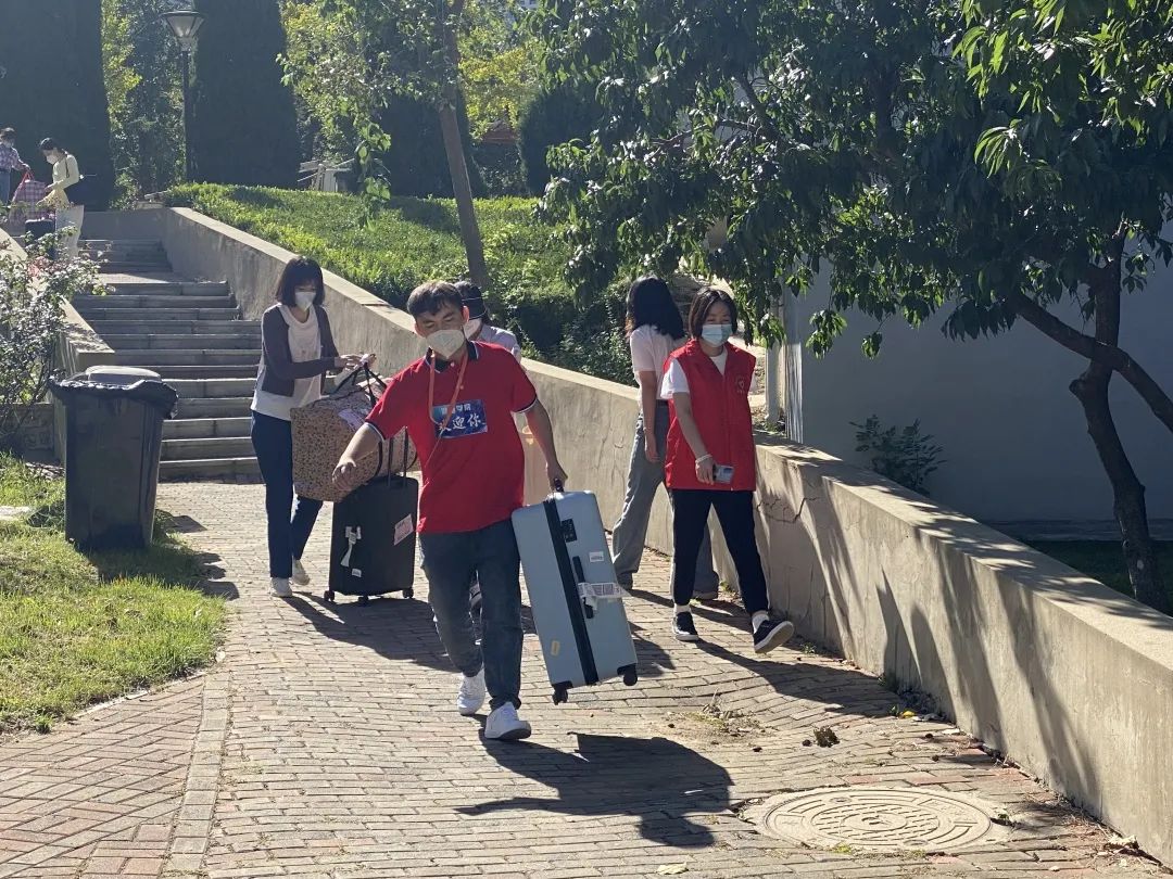 志愿者们紧接着帮助新生搬运行李、做好登记、分配钥匙、找寻寝室,有条不紊地做好每一个环节交接工作。顺利到达寝室后,志愿者们热心地为新生介绍寝室,答疑解惑。本次迎新实现了线下线上结合方式,线下由大一至大四的学生志愿者和老师组成,线上的小导、知心寝友们组成,他们通力合作,虽然人手有限也顺利的完成了此次迎新工作。