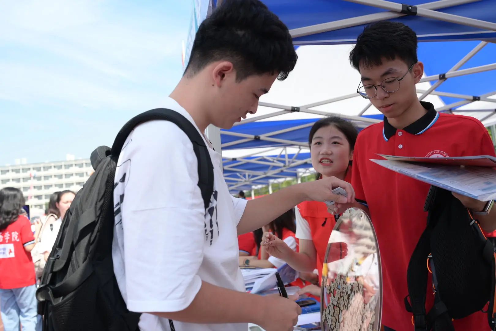 的工作人员便已就位,开始准备迎新材料,布置场地。在知心寝友、接站人员及学生会成员的帮助下,新生们陆续完成报到。