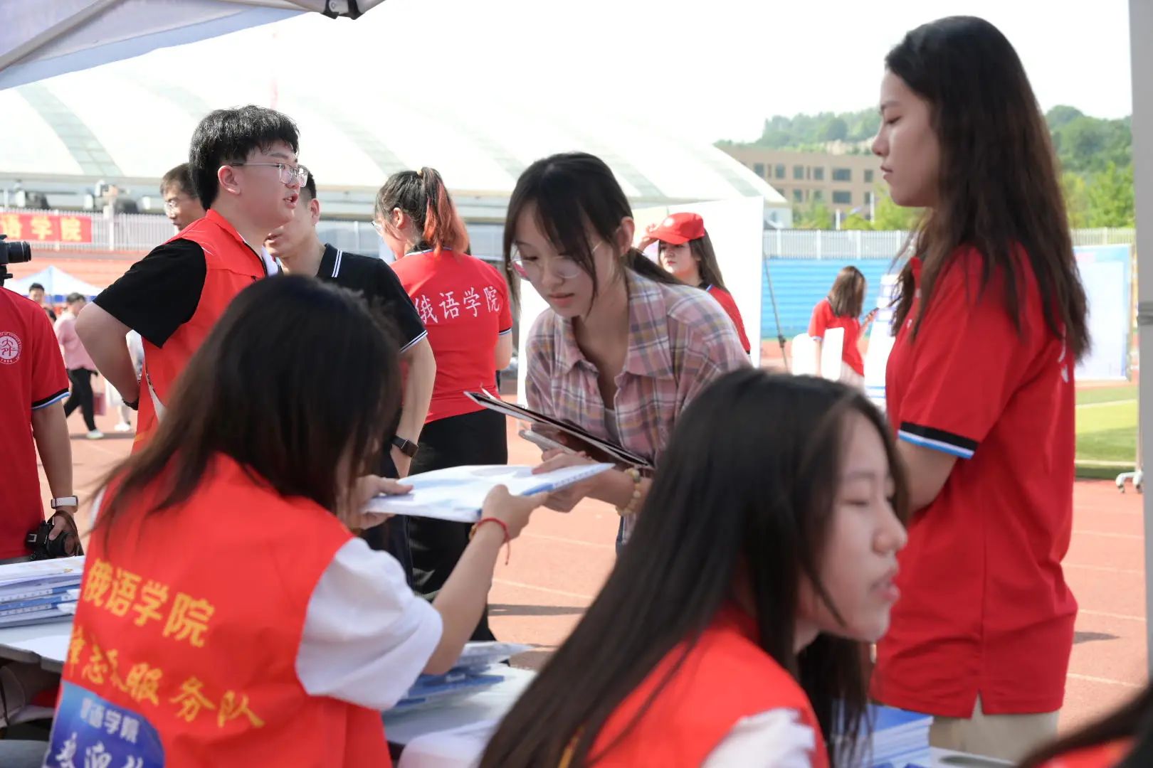 志愿者们接到新生后指引同学们来到操场签到,同时还为大家贴心准备了精美周边。身着异国传统服饰的志愿者也为小萌新们准备了一场别开生面的活动:分为皇冠信誉网