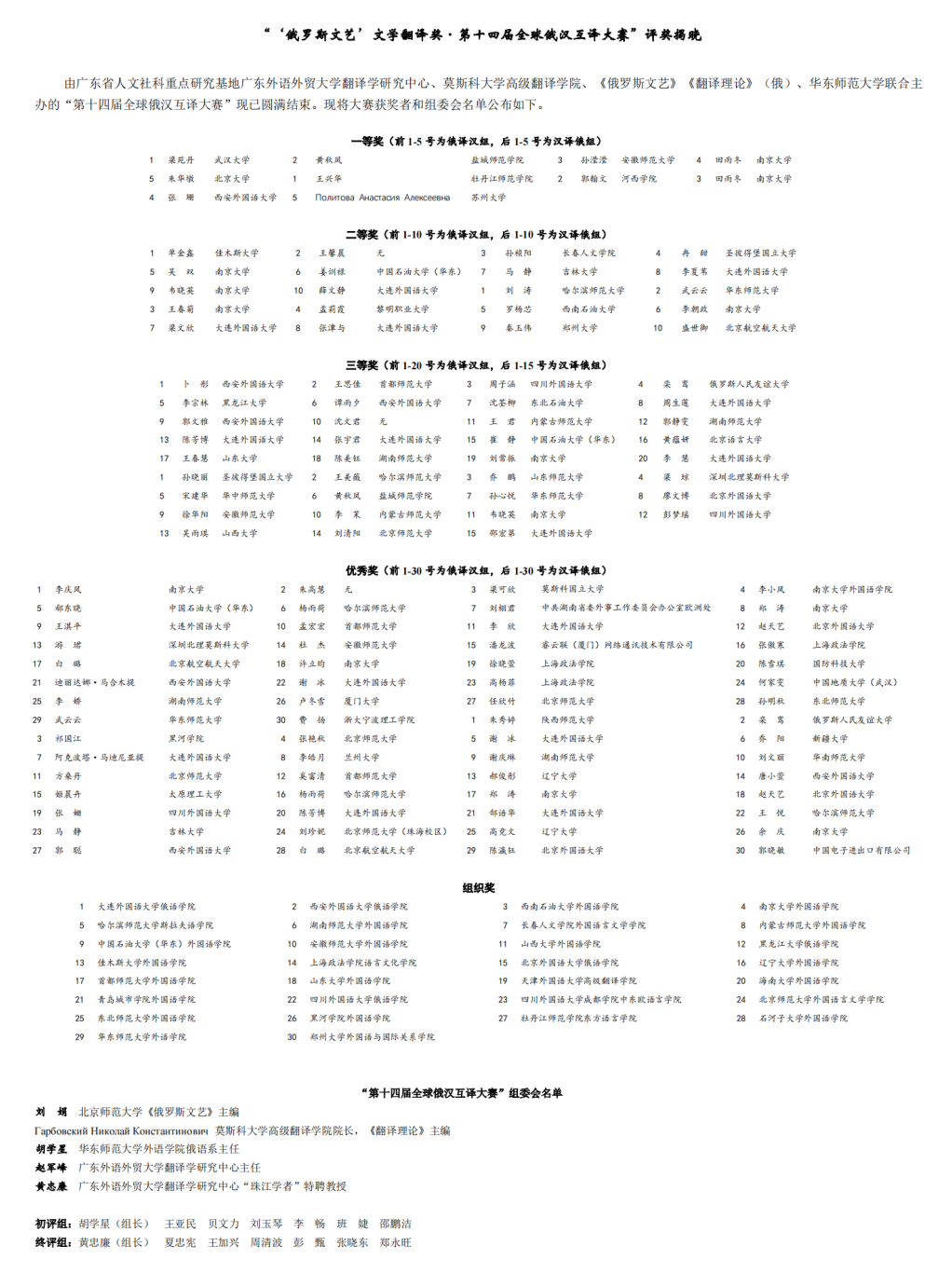 、《俄罗斯文艺》、《翻译理论》(俄)、华东师范大学联合主办。该赛事至今已连续举办了14届,是我国目前级别和水平最高、参赛人数最多并且在国内外都享有盛誉的权威性俄汉翻译赛事。本次大赛吸引海内外多人参赛,经初评、终评,共评选出一等奖10名,二等奖20名,三等奖35名,优秀奖60名。