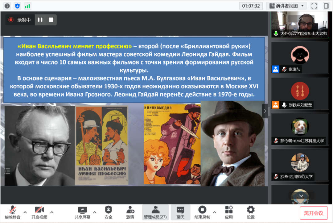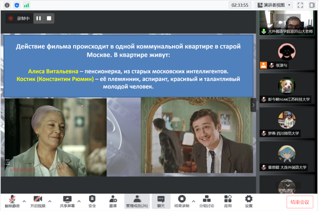 外教亚历山大和刘铁妹老师精心挑选和策划,为营员们奉献了一场精彩绝伦的俄语电影视听盛宴。两位老师通过对话和问答等形式带领同学们初尝影视作品翻译的乐趣,极大地调动了营员俄语学习和研究的兴趣。