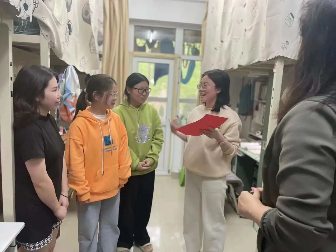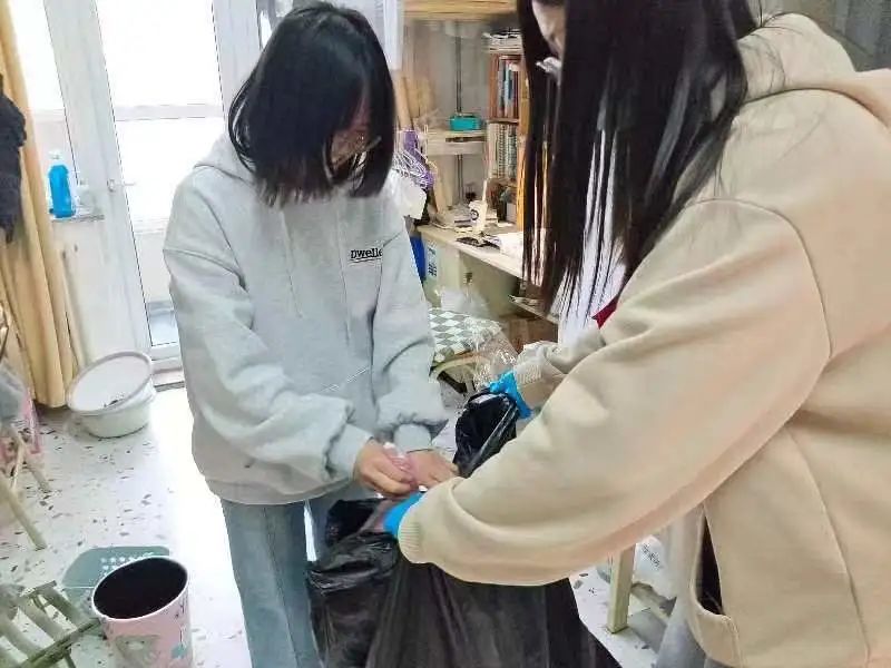 党总支书记梁小楠和辅导员美合日古丽来到了学生宿舍进行走访倡议,号召同学们外带垃圾、定期清扫寝室及楼道。老师们带来了亲切的问候,让阴冷的雨天也变得温暖起来。在老师的带领下,同学们对打扫自己的小屋,提升生活质量的大扫除活动都展现出了饱满的热情。大家纷纷拿起扫帚与拖把,浸湿抹布,仔细清洁了平日无暇顾及的卫生死角,让浮灰无处遁形。党员代表们更是穿梭于各个寝室之间,将大家的生活垃圾统一打包带到寝室楼外。