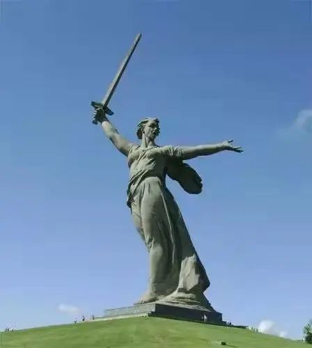 山岗上耸立着一尊象征“祖国-母亲”的高大的妇女雕像,高85米,其中身高52米、剑长33米,连底座重达800吨,这位顶天立地的女神已经成为城市的视觉中心。她面向波涛滚滚的伏尔加河,右手执利剑,左手指向柏林,号召着自己的英雄儿女冲锋陷阵,消灭敌人,被视为伏尔加格勒市和整个俄罗斯的象征。
