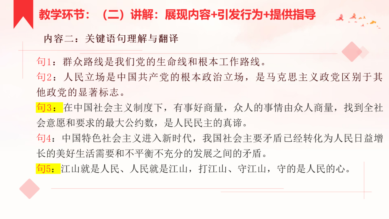 于老师在介绍教学方法与资源时,列举了展示法、讲授法、讨论法、启发式教学法、任务驱动法等多种教学手段,并提到了丰富的教学资源。在教学流程与目标设定方面,教师首先通过阐明学习目标、回顾先前知识经验等步骤,帮助学生清晰识别本单元的已知、未知及难点,随后利用视频资料深化学生对单元中心思想的理解,进而解析核心概念。在翻译教学与思想政治教育的融合实践中,重点在于对关键语句和核心段落的深入理解与翻译。于老师详细阐述了课堂讲授过程及课后思政教育的实施,并针对不同学生的学习状况,布置了相应的阅读拓展任务。最后,在教学反思环节,于老师着重考虑了教学目标的达成情况、课堂实际表现以及思政教育的完成度等方面,认为这些都是教学反思不可或缺的部分。