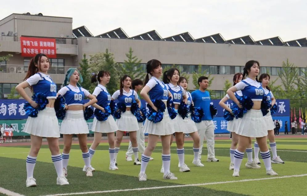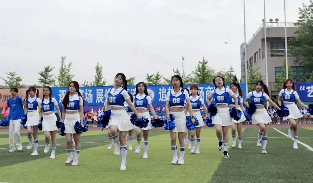 蓝天白云映衬着肆意明媚的青春。绿茵场上,队员们舞动手臂,舒展着曼妙的身姿。踏着音乐的鼓点,点燃热情,为运动健儿们加油鼓励。