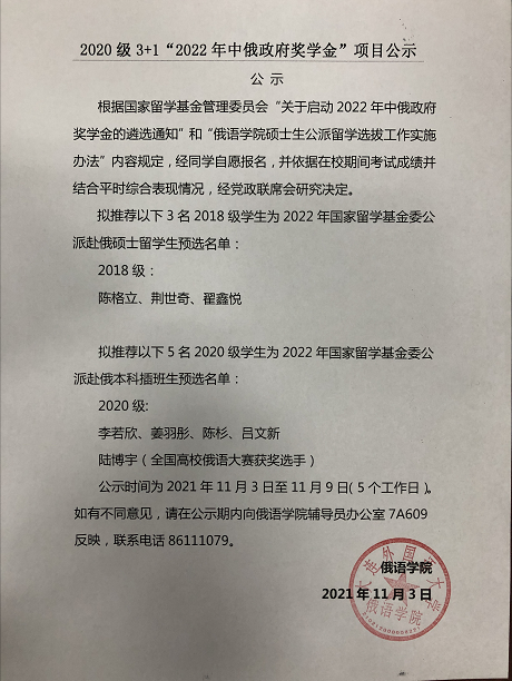2020级3+1“2022年中俄政府奖学金”项目公示