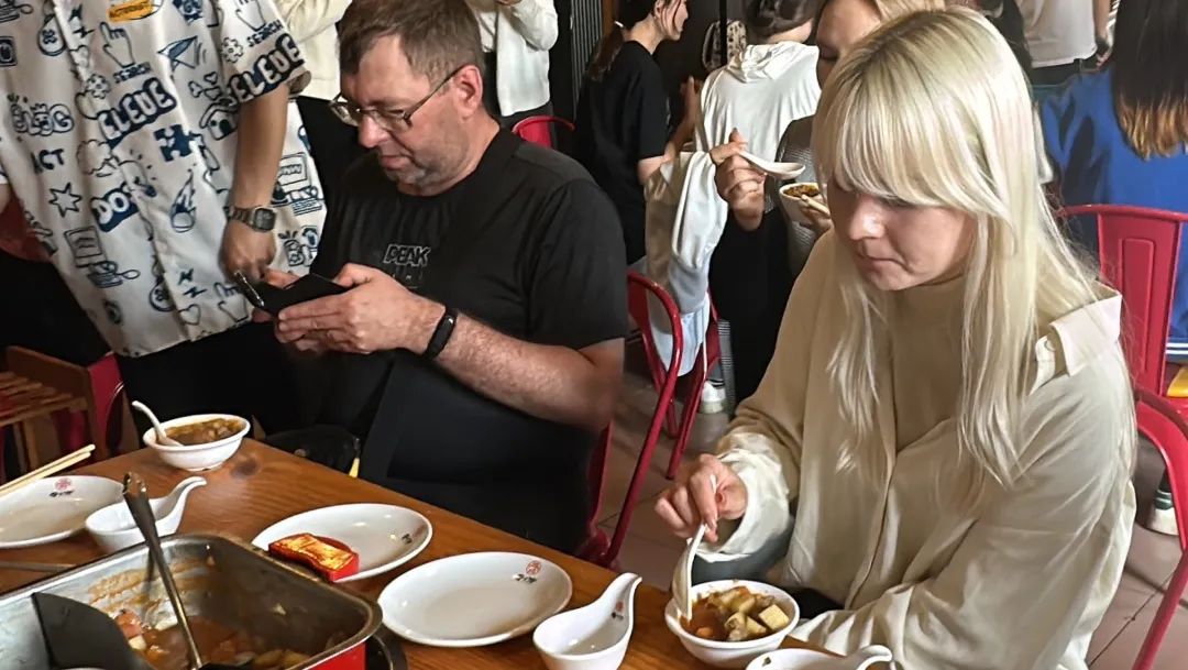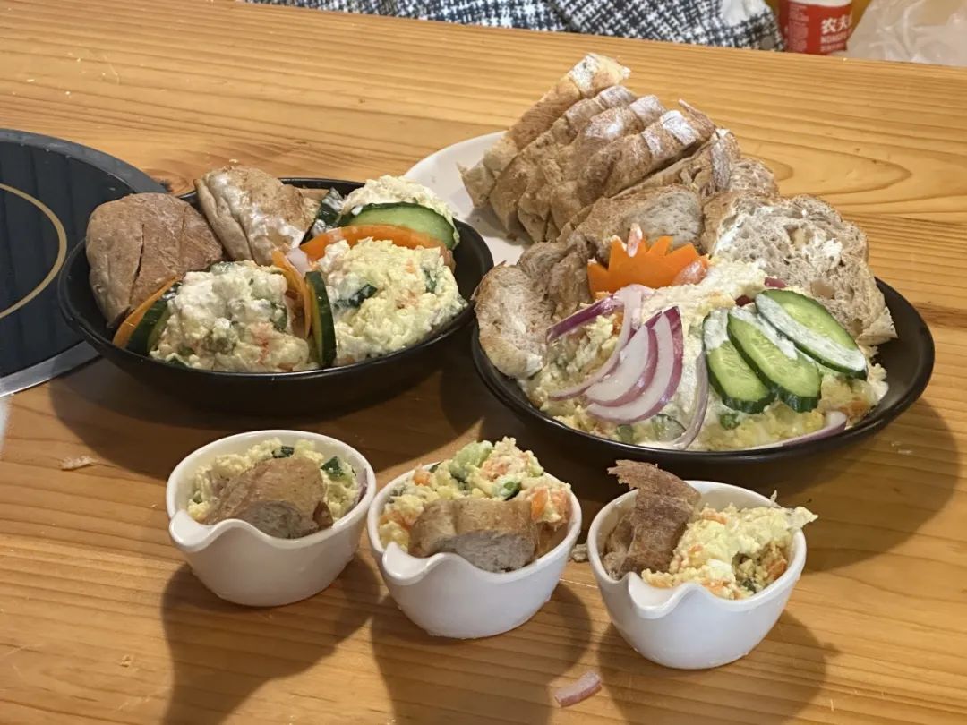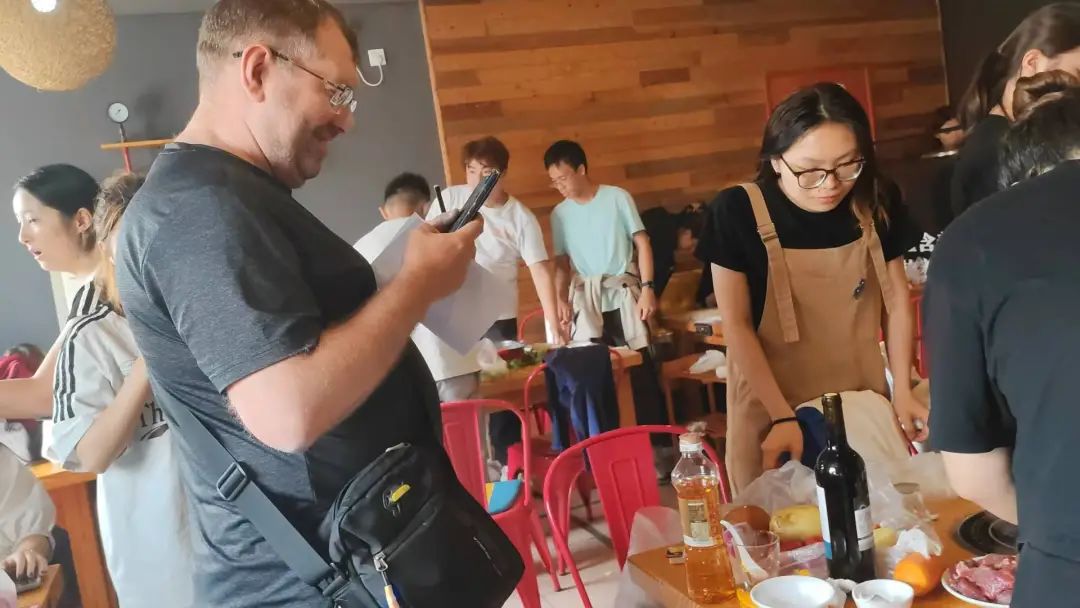 本次比赛邀请到外教马克西姆、塔妮娅、奥莉以及学生评委张铁楠、张梦欣、魏佳一担任评委,不一会评委席前佳肴纷呈。选手们需要用俄语向各位评委进行作品展示和味道阐述,评委们细细品味,认真打分,力求为每一道菜品做出公正的评判。